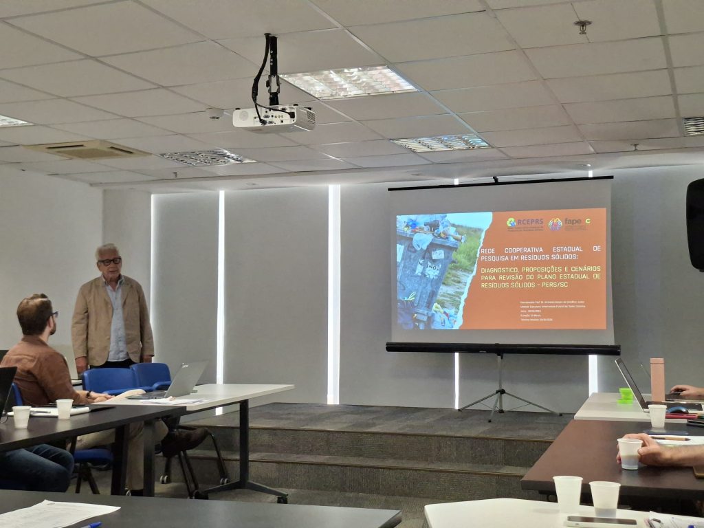 Na última quarta-feira, 24 de setembro, a Rede Cooperativa Estadual de Pesquisa em Resíduos Sólidos (RCEPRS) participou da reunião do Conselho Estadual de Saneamento (CONESAN), ocasião em que foi apresentado o projeto “Rede Cooperativa Estadual de Pesquisa em Resíduos Sólidos: Diagnóstico, Proposições e Cenários para Revisão do Plano Estadual de Resíduos Sólidos”. A apresentação foi conduzida pelo professor Armando Borges de Castilhos Jr., docente do Departamento de Engenharia Sanitária e Ambiental da UFSC e coordenador do Laboratório de Pesquisas em Resíduos Sólidos (LARESO).